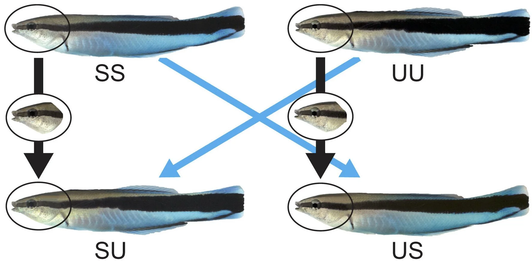 The results would be enough in 1970 to prove that cleaner fish had self-recognition, and a ‘self-concept’. We’d be able to sit back and marvel at the self-awareness of these amazing marine creatures. But these days we need more: perhaps the fish are somehow matching their movements to the mirrored wrasse instead of explicitly tending to their own bodies. So the Osaka scientists asked a further pertinent question: if these animals really are recognising themselves, what exactly are they paying attention to? In humans, it would be the face, which we spend a lot of time watching and from which we get a lot of clues about identity. Could it be the same for these fish? Time for their close-up.