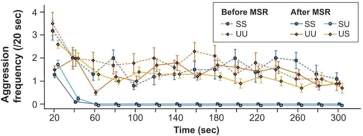In this chart, the SS and SU photos are the ones with the wrasse’s correct face. After a brief startle from seeing the photo, the cleaner fish apparently realises it’s just a self-portrait, and calms down. Show them the wrong face, though, and they remain aggressive for several minutes: