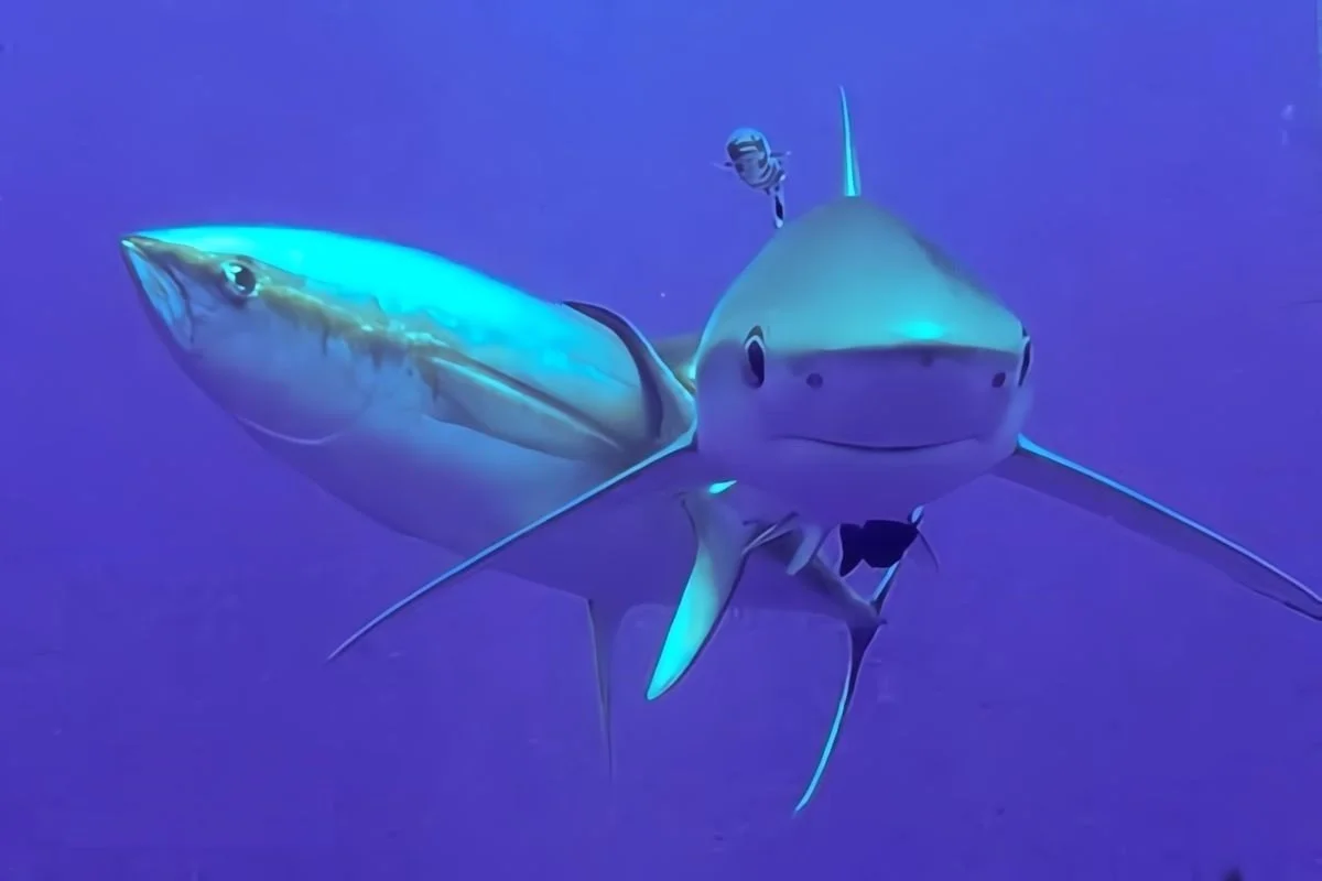 You know where this is going. Thompson and Meeuwig pored over the BRUVS footage and found three sites where it looked like one fish was rubbing itself against another one. At spots near Ascension Island, the Recherche archipelago and the Revillagigedo archipelago, the milieu of species attracted to the baited cameras included fish that were intentionally bumping into other animals. And while the bumper was usually a type of tuna, the bumped-against thing was often a live shark.