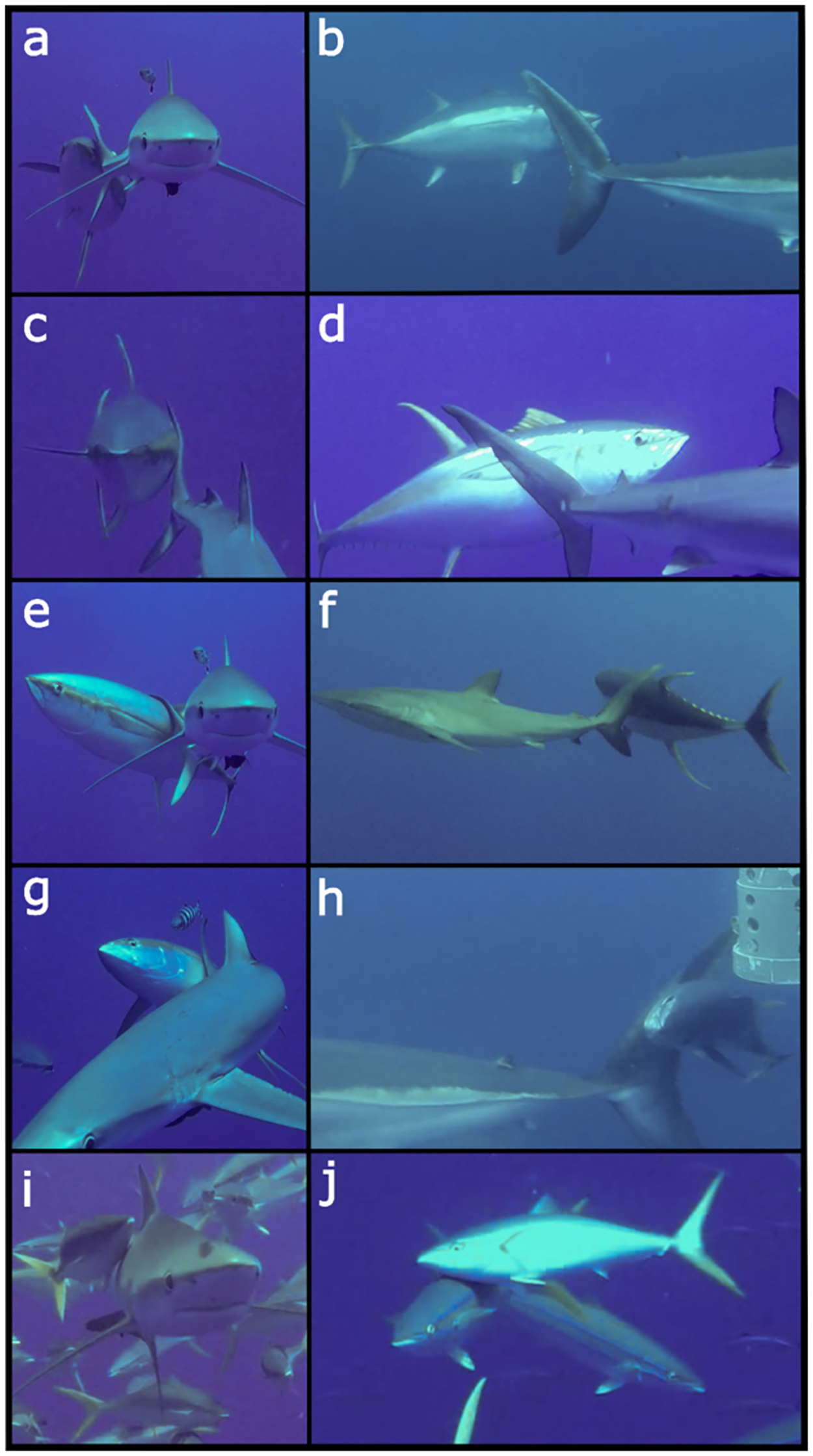 Which species are we seeing here? The bottom two photos show rainbow runners (Elagatis bipinnulata) scraping against a blue shark and other rainbow runners. All the rest show either southern bluefin (Thunnus maccoyii) or yellowfin (Thunnus albacares) tuna. They are deliberately scraping themselves against a variety of deadly predators: blue sharks (Prionace glauca) at Ascension Island in images a, c, d, e and g; shortfin mako sharks (Isurus oxyrhinchus) at Recherche Archipelago in photos b and h; and a silky shark (Carcharhinus falciformis) at Revillagigedo Archipelago in image f.